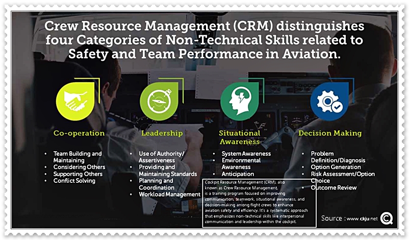 Diskusi mereka berdua seperti bertukar pikiran antar sesama kolega di suasana informatif. Mereka saling bertanya dan mengeluarkan pendapat. Bentuk suasana semacam ini sejatinya berlaku ketika mereka sudah berada di dalam kabin kokpit, namun tindakan itu sudah ditunjukkan sebelum mereka berada di kabin kokpit. Manajemen Kokpit yang baik diperkenalkan oleh ICAO yang dikenal dengan sebutan Cockpit Resource Management (CRM). Tujuan dibentuknya CRM, adalah untuk memperoleh performance keselamatan yang maksimal dan efektif dari hasil kerjasama antar awak kokpit yang bertugas.